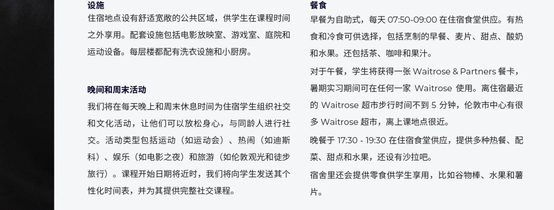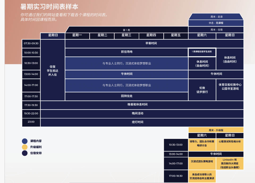 今年的项目比往年更好的是:项目分为一周或两周课程,同时推出高级版2周课程,包含了令人惊喜的升级版体验,包括:与行业内专业人士的私人社交晚宴、学生未来职业发展心理测试分析、linkedin 个人简历辅导和资料建设、特别团建活动、伦敦西区顶级音乐剧欣赏、业内人士出具的推荐信等。其中投资银行实践专业升级版的课程在伦敦政经学院LSE举行。