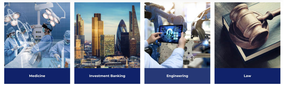 医药、投资银行、工程师、法律、心理学、企业家、建筑师、艺术、 电脑科学、牙医、时尚设计、电影、法医、国际政治、兽医