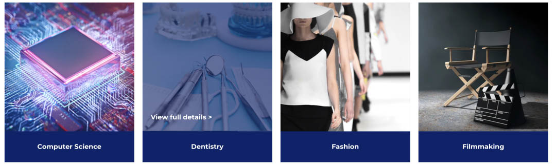 医药、投资银行、工程师、法律、心理学、企业家、建筑师、艺术、 电脑科学、牙医、时尚设计、电影、法医、国际政治、兽医